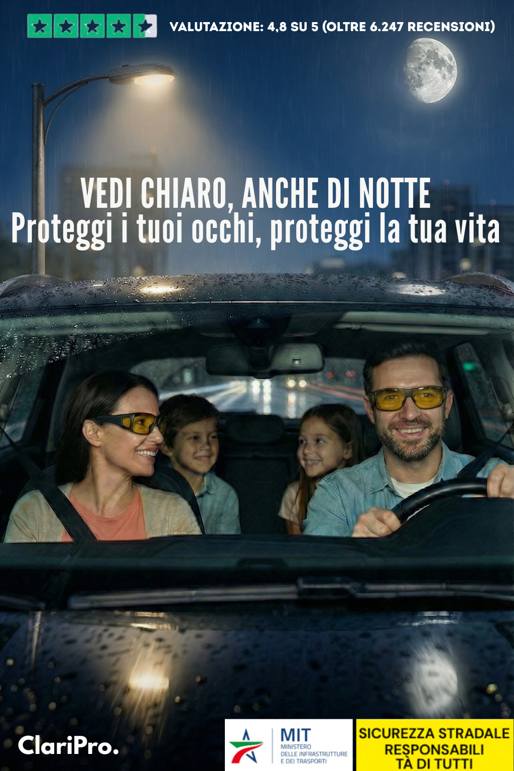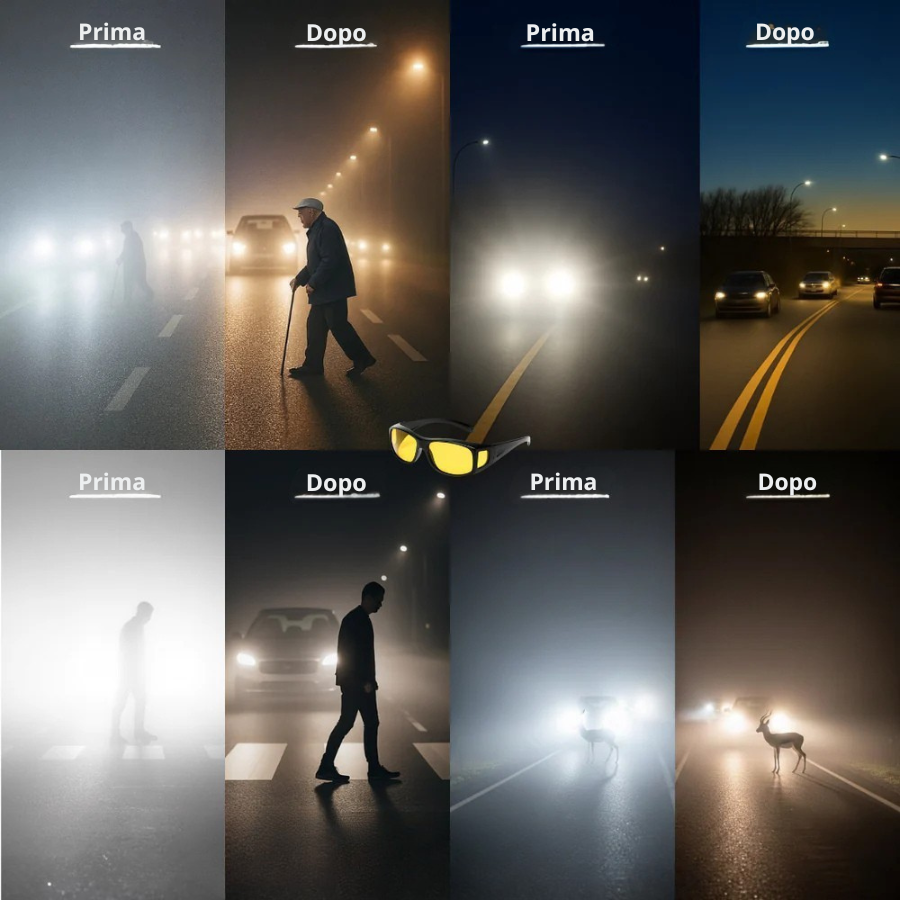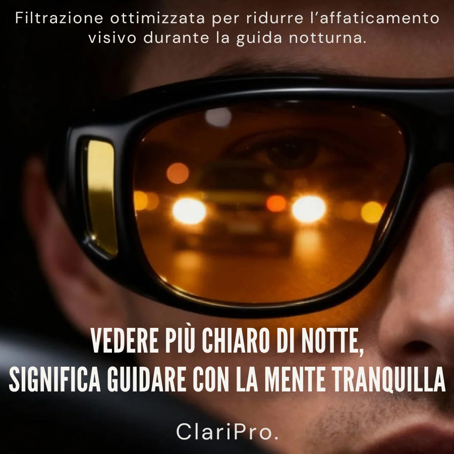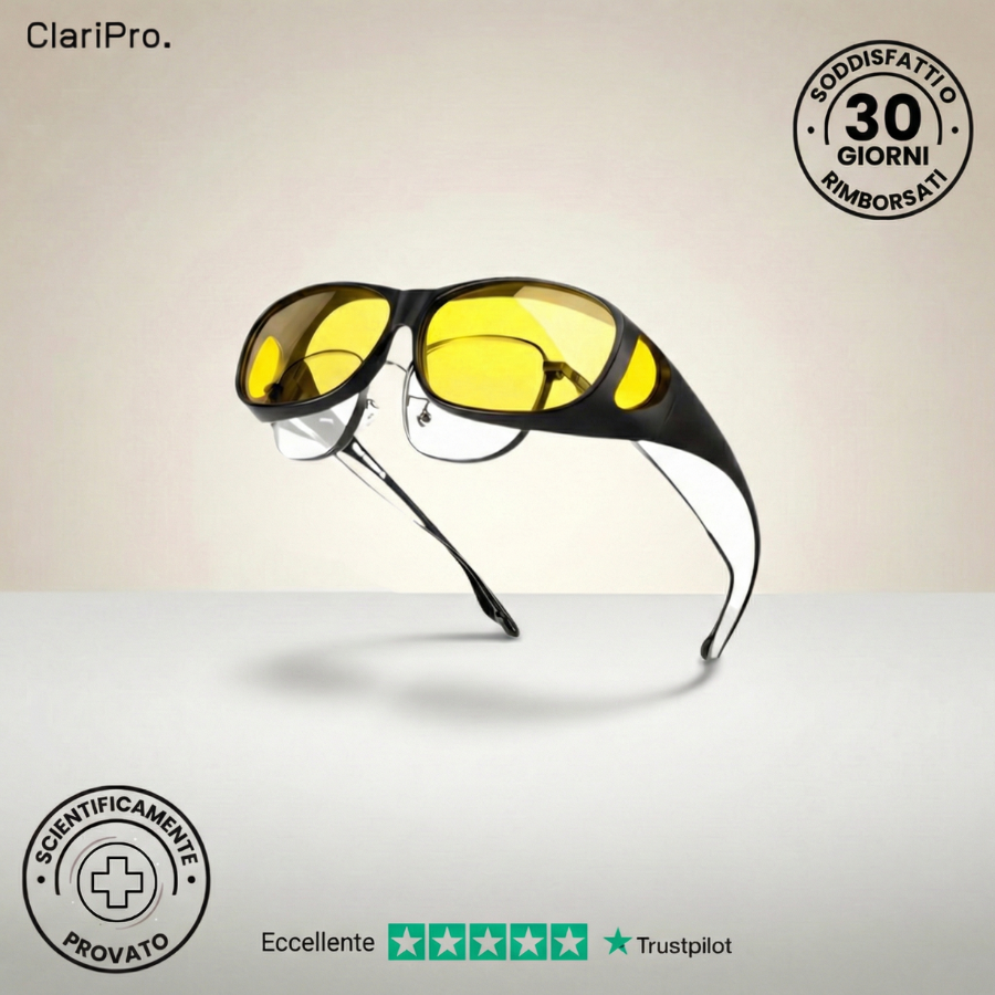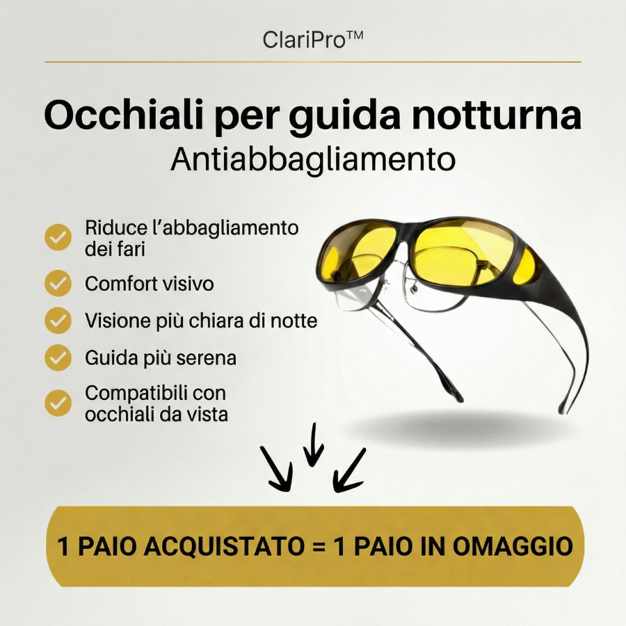 Gli occhiali ClariPro non curano la cataratta e non sostituiscono un controllo medico. Tuttavia, possono migliorare il comfort visivo riducendo l’abbagliamento e gli aloni luminosi, il che può aiutare alcune persone durante la guida notturna.