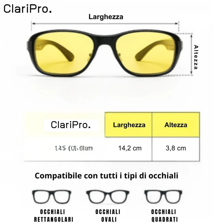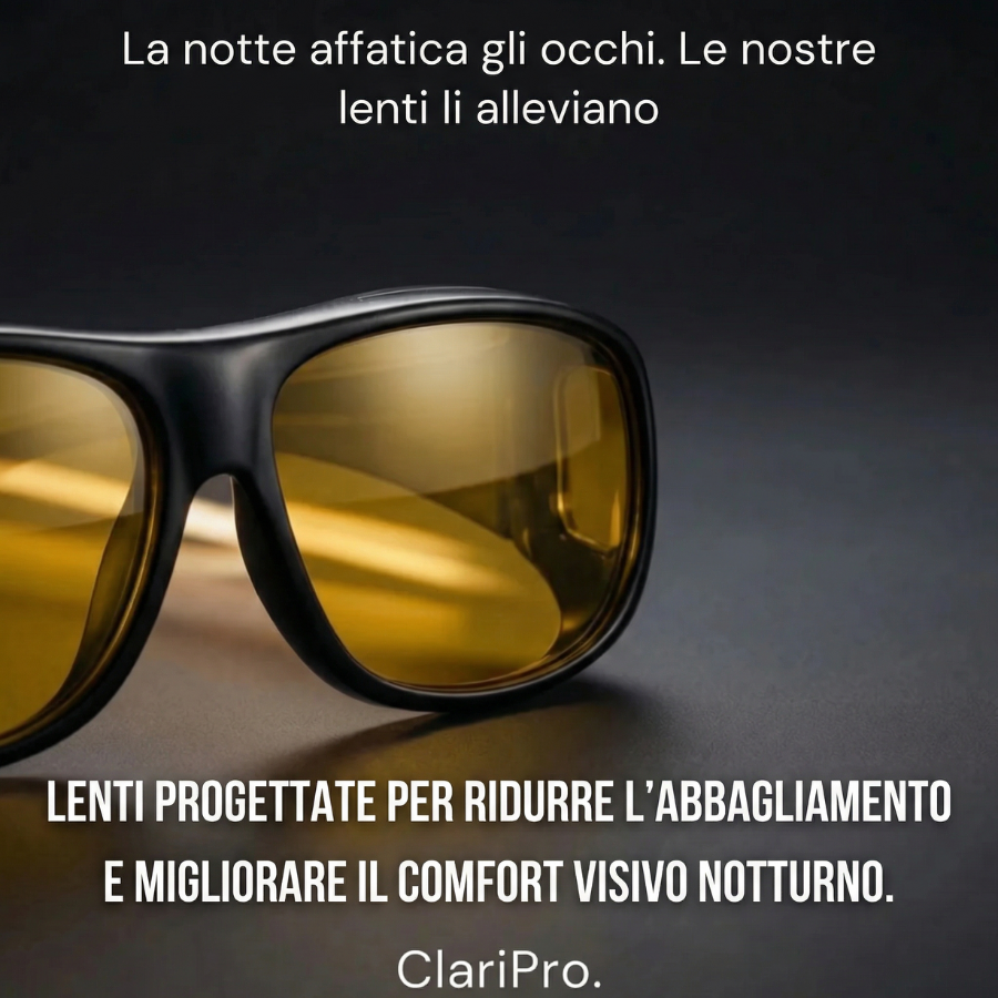 Gli occhiali gialli classici si limitano spesso a modificare la tonalità della luce. Gli occhiali ClariPro sono pensati per migliorare il comfort visivo, ridurre la diffusione della luce nell’occhio e limitare l’affaticamento oculare, in particolare durante la guida notturna.